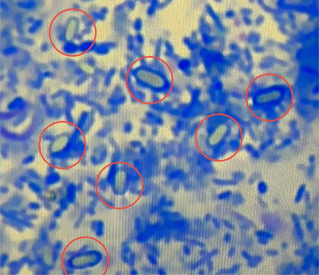 〇の印の中がウェルシュ菌です。顕微鏡の拡大倍率は1000倍です。