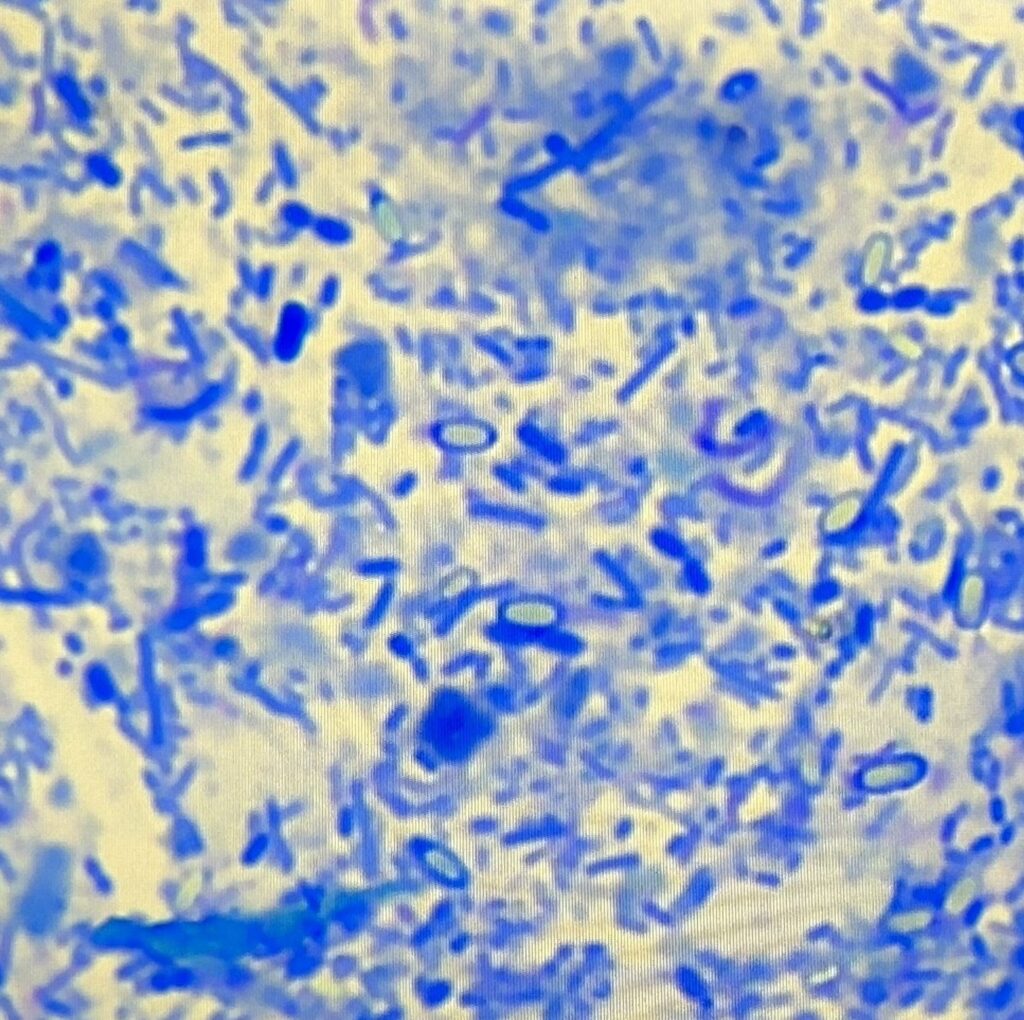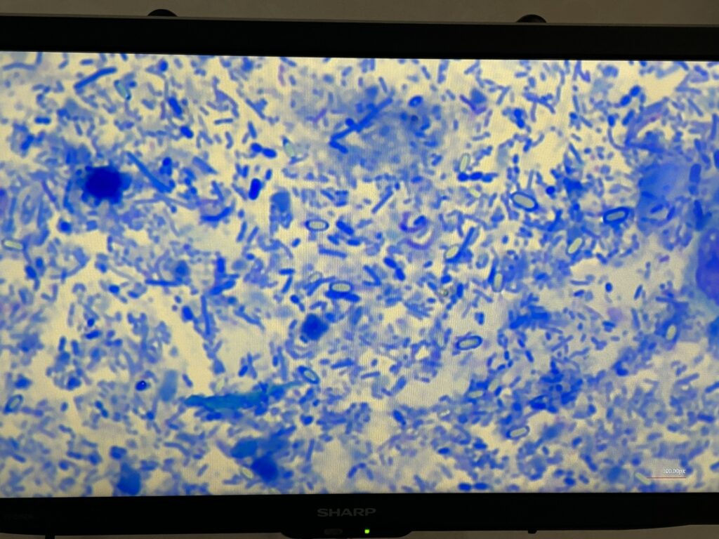 1歳前後の野良ちゃんを保護した方が、ワクチン接種に来院した折、水様の下痢をするというので糞便検査をしました。直接塗抹を染色したスライドを鏡検すると、写真のようにたくさんのウェルシュ菌が見られました。